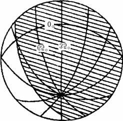 如图3晨昏圈与纬线的切点在45°W和135°E的经线圈上,而45°W在昼半球,那么太阳直射点经度为45°W。