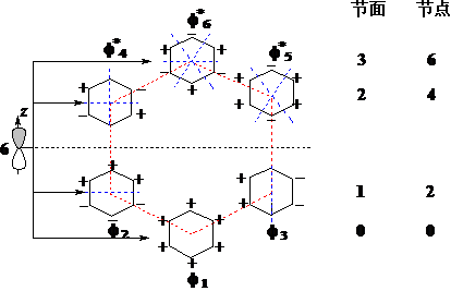 每个C都有一个PZ轨道和1个P-电子,由它们组合成苯的HMO。