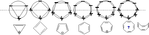 环状闭合共轭体系的休克尔分子轨道处于圆的内接正多边形的各个顶点,圆心的能量水平为原子轨道PZ的能量。如环丁二烯、苯等。