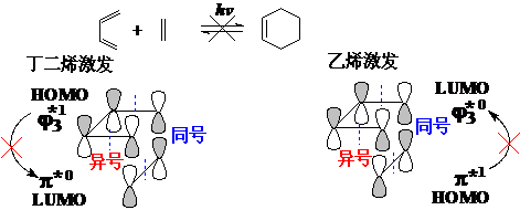 在光照条件下,如果丁二烯被激发,其HOMO为y3*1,而乙烯处于基态,其LUMO为p*,前者有2个节面,后者只有1个节面,所以是禁阻的;如果乙烯被激发,只能使用其HOMO-p*1,而基态丁二烯必然使用其LUMO-y3*0,同样是禁阻的: