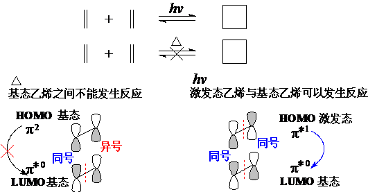 在加热条件下,乙烯都处于基态,一个分子的HOMO(为p)与另一个分子的LUMO(为p*),节面数目偶奇不同,所以2+2反应加热是禁阻的。