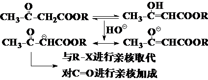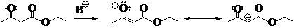 注意:乙酰乙酸乙酯(EAA)在碱性条件下形成的负离子,负电荷在氧原子上更合理(因为氧原子的电负性比碳大得多,更容易携带负电荷),极限式2比1的内能低,因此2的贡献比1大。所以在书写反应机理时,遇到这种离子,写成2更合理。
