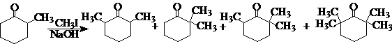 在合成中如果能巧妙地利用空间效应,可以从根本上改变反应收率,甚至改变反应产物的主次关系。如:a-甲基环己酮直接甲基化,选择性很差,生成多种产物的混合物,没有合成价值: