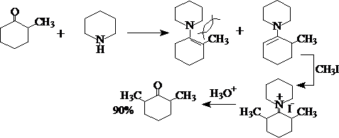 利用体积较大的环状仲胺导入空间效应,则可以得到90%的 a,a’-二甲基环己酮: