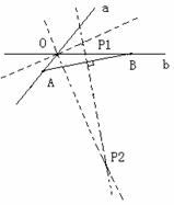 两条公路a、b相交于点O,A、B为两个收购站,请在这块地上找一个仓库P,使仓库到两个收购站的距离相等。