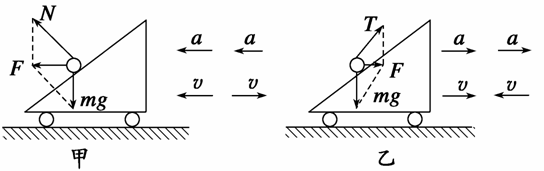 解析 小球相对于斜面静止时,与小车具有共同加速度,如图甲、乙所示,向左的加速度最大则T=0,向右的加速度最大则N=0,根据牛顿第二定律,合外力与合加速度方向相同沿水平方向,但速度方向与力没有直接关系.