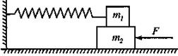 8.(江苏黄桥中学2009届高三上学期月考)如图所示,质量kg和kg的两物体,叠放在动摩擦因数为0.40的粗糙水平地面上,一处于水平位置的轻弹簧,劲度系数为200N/m,一端固定于墙壁,另一端与质量为m1的物体相连,弹簧处于自然状态,现用一水平推力F作用于质量为m2的物体上,使它缓慢地向墙壁一侧移动,取g=10m/s2,当移动0.50m时,两物体间开始相对滑动,这时水平推力F的大小为(C )