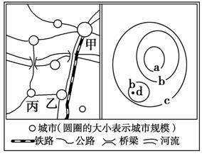 ①共有三级城市等级体系 ②甲城市服务范围比乙城市广 ③二级城市数目比三级城市数目多 ④乙、丙都是甲城的卫星城,服务功能相同