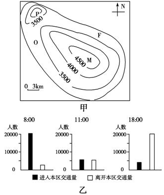 近几年,不断上涨的房价和拥堵的交通备受关注。下面图甲是我国某城市平均房价等值线(单位:元/m2)分布示意图,图乙是该城市某一区域不同时间的地铁使用量统计图。据此回答15-17题。