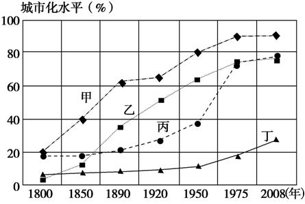 读甲、乙、丙、丁四国城市化水平变化示意图,回答18-19题。
