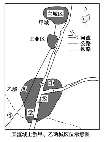 解析:第21题,造纸企业有严重的大气污染和水污染,应布局在城区盛行风的下风向和城区河流的下游。结合图示,仅从甲地考虑,可以位于该地的工业区附近,但会对乙城造成严重的污染。故不宜引进。第22题,住宅区应位于环境较好的城市上风地带;CBD应布局在交通便捷、流动人口多的市中心。