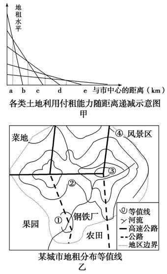 27.经济因素是市场经济条件下影响城市功能分区的主要因素。读各类土地利用付租能力随距离递减示意图甲和某城市地租分布等值线图乙,回答下列问题。(13分)