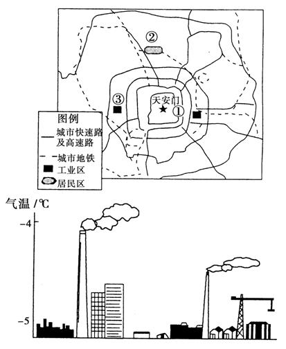 (1)图中①处为北京的CBD,它没有分布在市中心是受 因素影响。②处布局居民区是为了 ,居民区布局在此的有利因素主要是 。