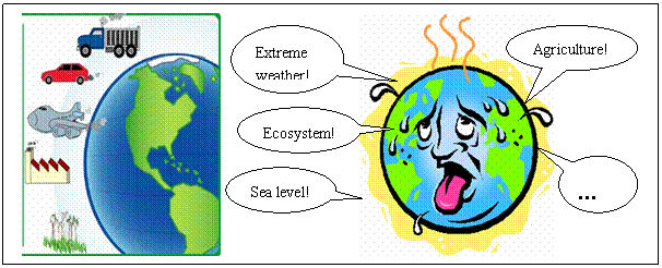 Global warming will cause some disastrous effects. In the first place, some island will disappear because of the rise of sea level, and thus people of certain countries will have to look for new places to live. Extreme weather, will also result from global warming. When temperature rises, the production of crops will decrease, which directly endangers people’s lives. If the temperature keeps rising, some animals and plants will disappear from the planet, thus destroying the ecosystem.