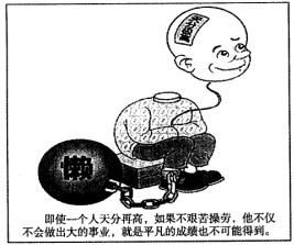 In the cartoon,the man enjoys being clever and wishes to do a great job.However,regretfully,he is firmly fastened to his original position by the nature of laziness and certainly achieves nothing.