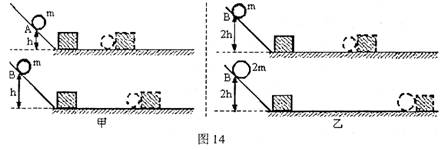 (1)让质量相同的两个小球沿同-光滑斜面分别从A处和B处开始向下运动,然后与放在水平面上的纸盒相碰,纸盒在水平面上移动一段距离后静止,如图14甲所示。