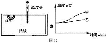 22. 某物理课外实验小组,对照明灯具的发光与发热问题产生了兴趣。在老师的指导下,他们设计实验方案并进行了探究:选用两个如图15所示的相同密封盒子,将两只额定功率相同但种类不同的照明灯甲和乙分别安装在灯座上,并让两灯正常工作,用温度计测量通电后两盒子中的温度,每隔1min记录一次温度值,通电15min,将测得的数据描绘成如图15所示的图象。