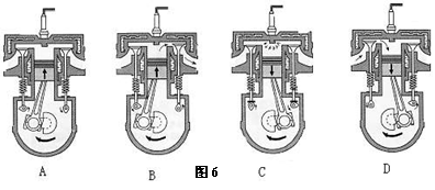 14、图6是汽油机工作的四个冲程(顺序已打乱),汽油机一个工作循环对外做功_____次;图______是做功冲程,请按一个工作循环的过程,将四个图重新排序:____________