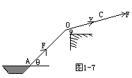 例4 如图1-7所示,一人站在岸上,利用绳和定滑轮,拉船靠岸,在某一时刻绳的速度为v,绳AO段与水平面夹角为θ,不计摩擦和轮的质量,则此时小船的水平速度多大?