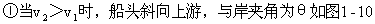 ②当v2<v1时,如图1-11船头斜向上游,与岸夹角为θ时,用三角形法则分析当它的方向与圆相切时,航程最短,设为S,由几何关系可知此时v2⊥v(合速度)(θ≠0)