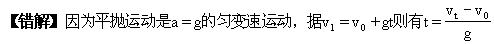 [错解原因]形成以上错误有两个原因。第一是模型与规律配套。Vt=v0+gt是匀加速直线运动的速度公式,而平抛运动是曲线运动,不能用此公式。第二不理解运动的合成与分解。平抛运动可分解为水平的匀速直线运动和竖直的自由落体运动。每个分运动都对应自身运动规律。