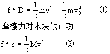 例4 如图3-6,质量为M的木块放在光滑水平面上,现有一质量为m的子弹以速度v0射入木块中。设子弹在木块中所受阻力不变,大小为f,且子弹未射穿木块。若子弹射入木块的深度为D,则木块向前移动距离是多少?系统损失的机械能是多少?
