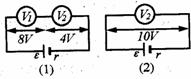[例1]如图所示,电压表 Vl、V2串联接入电路中时,示数分别为8 V和4 V,当电压表V2接入电路中时,如图(2)所示,示数为 10 V,求电源的电动势为多少?