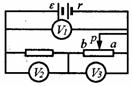 解析:在闭合回路中,内、外电路电压降之和等于电源的电动势.在滑线变阻器的滑动片P由a滑到b的过程中,滑线变阻器连入电路中的电阻在减小,它的分压作用在减小,也就是电压表V3的示数要减小.由于滑线变阻器连入电路中的电阻在减小,由闭合回路的欧姆定律可知电路的总电流是增大的,电压表V2的示数是增大的.电压表V1测量的是电源的路端电压U,由U=ε-Ir式可知,电压表V1的示数变化反映了内电路上电压的变化值,且它们大小相等,符号相反(路端电压是减小的,但是内电路上的电压降U/是增大的).由ε=U+U/可知,由于电源的电动势ε不变,在闭合回路中,电压的变化量之和就为零,也可以说是电压减小的值与电压增大值之和相等,即ΔU1十ΔU2=ΔU3,根据此式可以排除 C选项,对于A选项,由于ΔU1是反映电源内电路上的电压降的变化,电源有内阻,ΔU1=0显然是错误的,所以只有B和D选项是正确的.