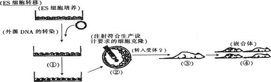 35.(09届江苏省百校高三样本分析考试生物试34B)题胚胎干细胞介导法(转基因动物培育的途径之一),即将外源基因导入胚胎干细胞,然后将转基因的胚胎干细胞注射于受体动物胚胎后可参与宿主的胚胎构成,形成嵌合体,直至达到种系嵌合。下图是实验过程示意图,请分析回答下列问题: