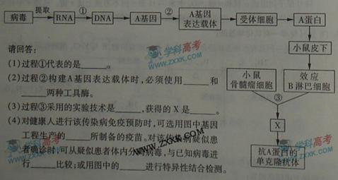 (4)对健康人进行该传染病免疫预防时,可选用图中基因工程生产的 所制备的疫苗。对该传染病疑似患者确诊时,可以疑问患者体内分离病毒,与已知病毒进行