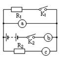 如下图所示,a、b、c表示的是电压表或电流表,当K1、K2都闭合时,下列正确说法是