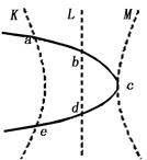 图中K、L、M为静电场中的3个相距很近的等势线.一带电粒子射入此静电场中后,仅在电场力作用下沿abcde轨迹运动.已知电势φK>φL>φM.下列说法中正确的是![]()