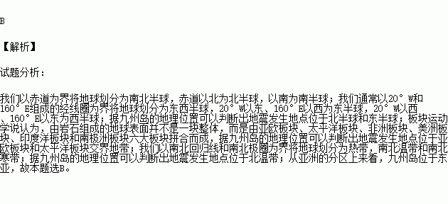 2016年4月16日00时25分在日本九州岛附近(32.77°N, 130.78°E)发生6.9级左右地震,据此作出了以下判断,其中正确的是( )