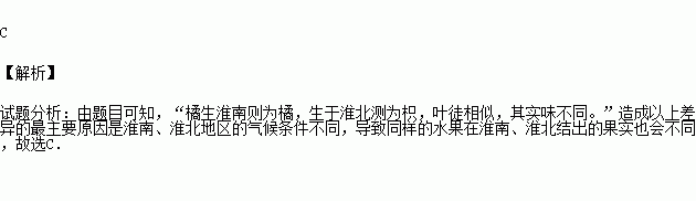 “橘生淮南则为橘,生于淮北测为枳,叶徒相似,其实味不同。”造成以上差异的最主要的原因是 ( )