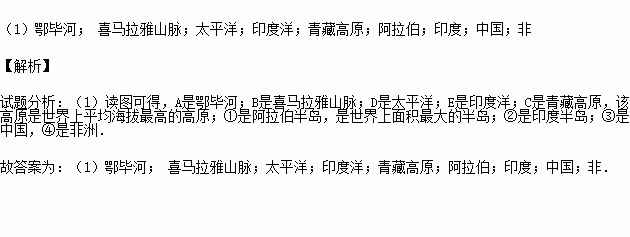 河流A ;山脉B ;大洋D ;E ;高原C ;