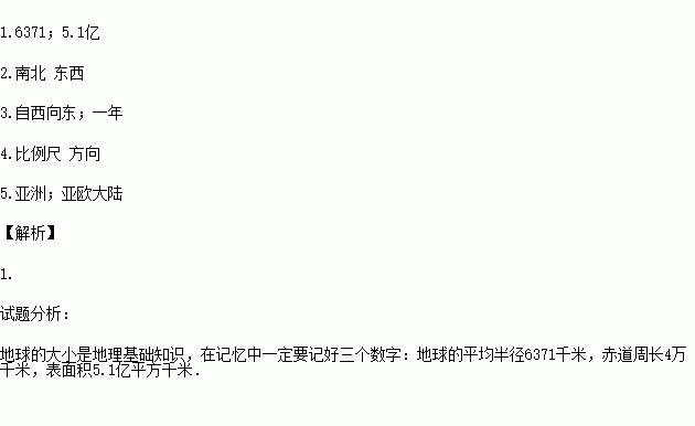 1.地球的平均半径约为 千米;地球的表面积约为 平方千米。