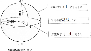 (2)地球的平均半径为6371千米,地球表面积为5.1亿平方千米,最大周长约4万千米.