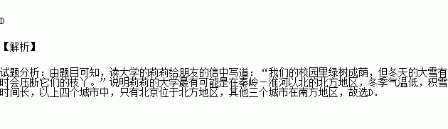读大学的莉莉给朋友的信中写道:“我们的校园里绿树成荫,但冬天的大雪有时会压断它们的枝丫。”请你判断莉莉的大学可能位于下列哪个城市