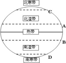 解答 解:热带的纬度范围是23.5°N-23.5°S,北温带的纬度范围是23.5°N-66.5°N,北寒带的纬度范围是66.5°N-90°N,南温带的纬度范围是23.5°S-66.5°S,南寒带的纬度范围是66.5°S-90°S.