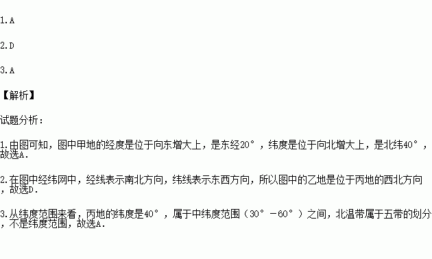 A.东经20°,北纬40° B.东经40°,北纬20°