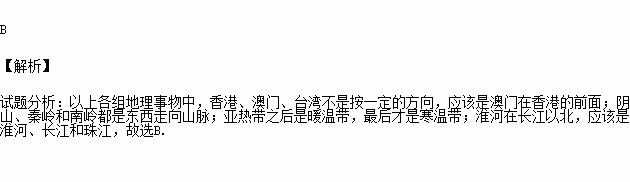 A.香港、澳门、台湾 B.阴山、秦岭、南岭