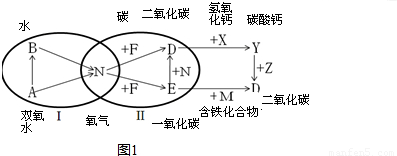 解答:解:Y是大理石的主要成分,即为碳酸钙,而D和X能够反应生成碳酸钙,且碳酸钙和Z能够反应得到D,可以看出D为二氧化碳,而DE组成元相同,则E为一氧化碳.E转化为D有两种方式,一是和单质N反应生成二氧化碳,所以N为氧气;而和M反应,就应该是氧化性金属氧化物反应,M可以为四氧化三铁、氧化铁、氧化亚铁等.由于氧气和单质F反应可以得到二氧化碳或者一氧化碳,所以单质F只能为碳.AB都能生成氧气,且A能够成B,所以A为过氧化氢,B为水.结合反应类型,整个分析符合题意,圈I全是分解反应,圈II全是化合反应.对应图为: