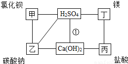 (6分)如图中每条连线表示两端的物质可以发生化学反应,甲、乙、丙、丁分别为Mg、BaCl2、Na2CO3、HCl中的一种。![]()