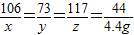 x═10.6g  y=7.3g  z=11.7g