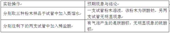 (8分)有三种白色粉末.分别是碳酸钡、硫酸钡和碳酸钠。请设计一个实验方案.把这三种粉末区分开来。叙述实验操作、预期现象和结论。