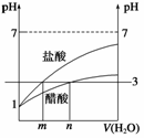 (2)由上图可知,若两者稀释相同的倍数,则盐酸的pH小于醋酸的pH,若要两者的pH相等,则盐酸稀释的倍数大于醋酸稀释的倍数,故有m>n。