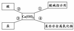 对知识的归纳和总结是学好化学的重要方法。在学习了碱的性质后,小红同学总结了氢氧化钙的四条化学性质(如图),即氢氧化钙与图中四类物质能够发生化学反应。