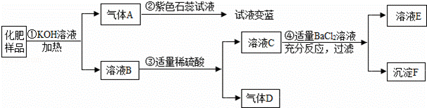 某化肥KNO3样品在运输存放过程中可能混进了NH4Cl、(NH4)2 SO4,K2CO3三种物质中的一种或几种,现按如图所示进行检验,出现的现象如图中所述(设过程中所有发生的反应都恰好完全进行).试根据实验过程和发生的现象回答下列问题:![]()