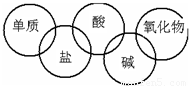 28、整理归纳物质性质之间的相互联系是学习化学的一种有效方法.请你从学习过的金属单质、非金属单质、酸、碱、盐中分别选一种代表物,用化学式填写圆圈中,使两环相连表两种物质之间能相互发生反应.
