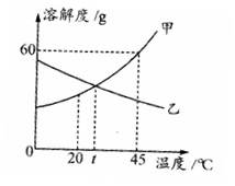 如下图是甲、乙两种固体物质的溶解度曲线。请回答:甲物质在45℃时的溶解度为 ;甲、乙两物质的溶解度相等时温度是 ;